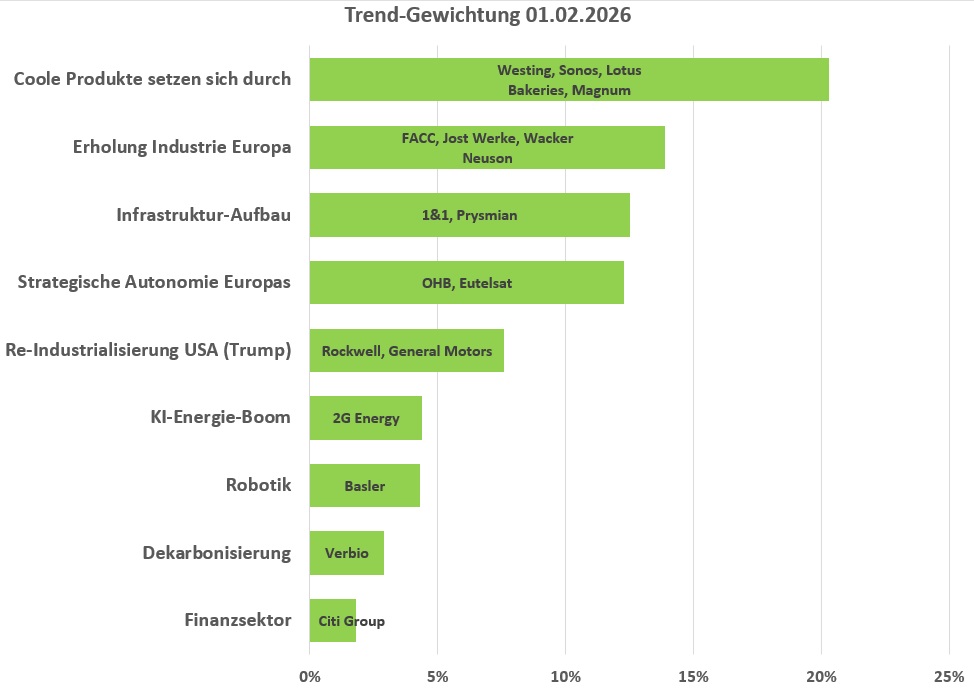 Das Trend-Surfer Wikifolio besteht aktuell aus 17 Unternehmen und den folgenden Trends: