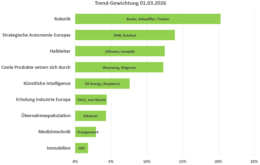 Das Trend-Surfer-Portfolio wurde daher stark adjustiert und hat nun einen relativ defensiven Charakter, was daran ersichtlich wird, dass Medizintechnik/Immobilien mit ca. 10% gewichtet sind und mit Klöckner (7,4% Gewichtung) ein relativ marktunabhängiger Wert aufgenommen wurde, der aufgrund eines Übernahmeangebots auf der Unterseite preislich abgesichert ist.