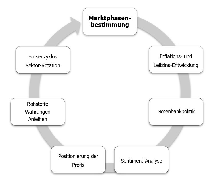 Abschließend wird der Börsenzyklus betrachtet und die laufende Sektor-Rotation analysiert. Dadurch lässt sich erkennen, in welcher Phase sich der Markt befindet und welche Branchen aktuell besonders gute Chancen auf überdurchschnittliche Kursentwicklungen bieten.